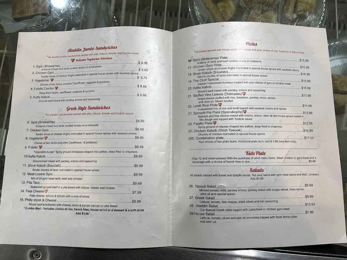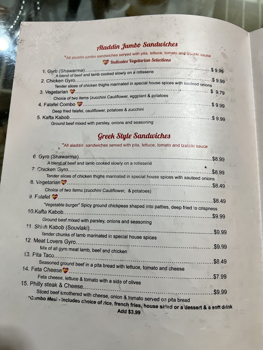 The Aladdin Jumbo Sandwiches are perfect for those looking for a more substantial meal. You can enjoy a Gyro (Shawarma) for $1, or go for the Kufta Kabob at $5. For vegetarians, the Falafel Combo at $4 offers a tasty and filling option.
