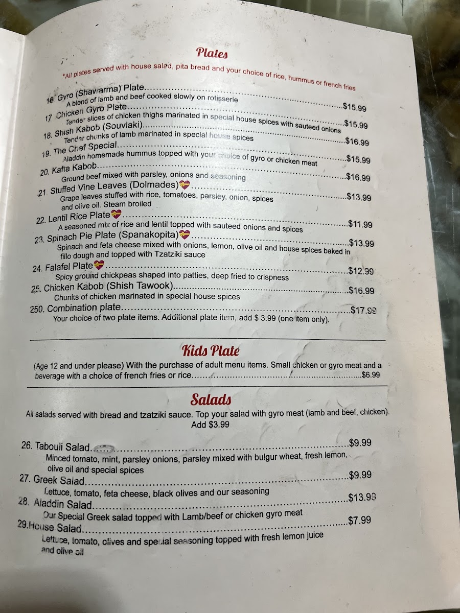 Finally, don’t miss the fresh and healthy Salads like the Greek Salad at $27, the refreshing Aladdin Salad at $28, or the light and zesty Tabouli Salad for $26. Whether you're craving something light or hearty, Café Aladdin’s menu provides a delicious variety of flavors to satisfy every palate.