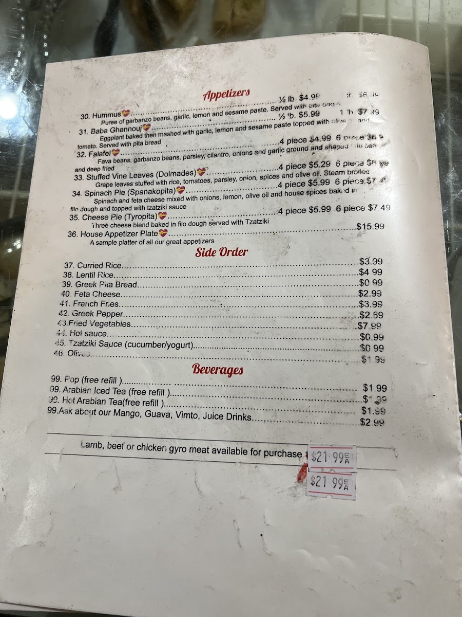 For a more complete meal, check out the Plates section, which includes the savory Lentil Rice Plate for $22, or the Chicken Gyro Plate for $17. The Combination Plate, priced at $250, gives you a sampling of multiple dishes for a satisfying experience.